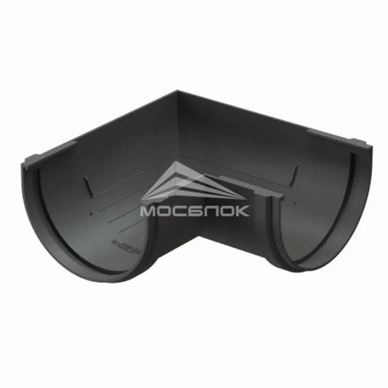 Угол желоба устанавливается на внешних и внутренних углах кровли и предназначен для соединения желобов под углом 90° в целях изменения направления движения воды.
