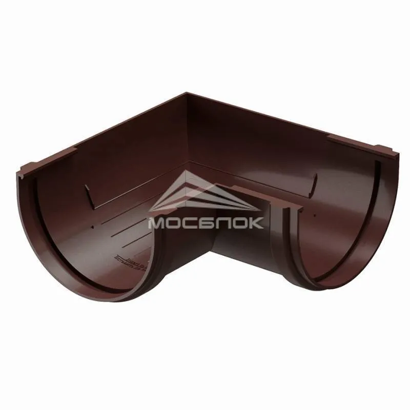 Угол желоба устанавливается на внешних и внутренних углах кровли и предназначен для соединения желобов под углом 90° в целях изменения направления движения воды.