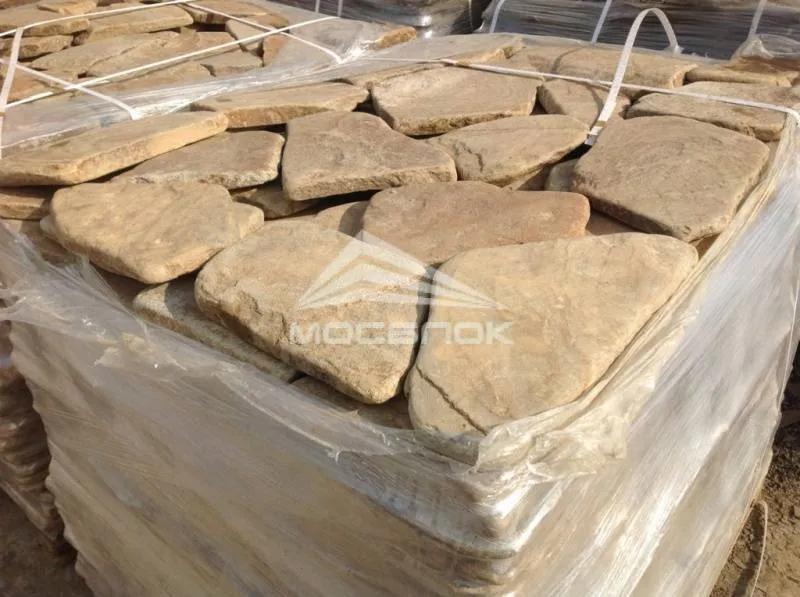 Песчаник галтованный медовый внешне выглядит как небольшие плоские плиты разных размеров и неправильной формы. Благодаря разным формам, можно создавать индивидуальный и неповторимый рисунок фасада дома, цоколя или дорожки.