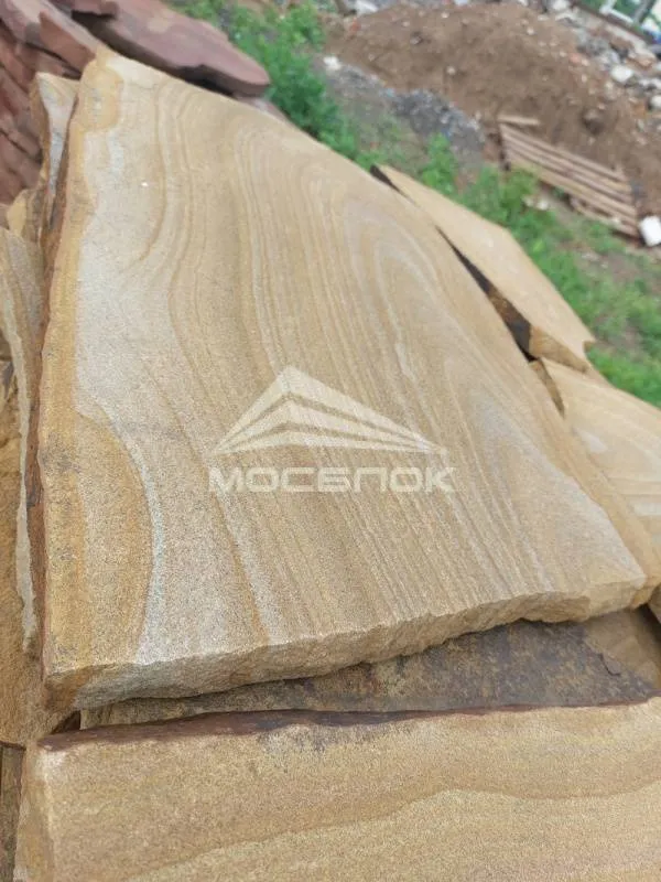 Песчаник тигровый бежевого цвета, с ярко выраженными разводами. Камень природного происхождения, мелкозернистый. Сфера применения: от внутренних помещений - камины, барбекю до внешнего - вертикальные поверхности, цоколи, подпорные стены, отмостки, дорожки, площадки. Толщина данного природного камня составляет от пятнадцати, до сорока пяти миллиметров. А его отличительными чертами является уникальная цветовая палитра, которая напоминает окрас тигра. Данный плитняк имеет хорошую прочность и хорошо выдерживает физические нагрузки, перепады температур.