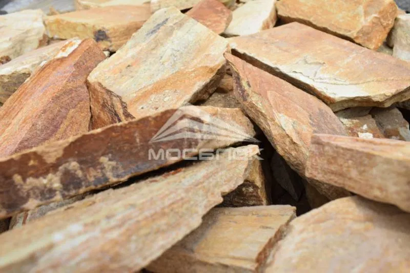 Златолит желтый – камень золотистого оттенка и добывается на Карабашском карьере в Челябинской области. Помимо этого плитняк называют – Кварцит. Цвет камня является его отличительной особенностью: он имеет редкий красивый блеск. Наличие золотых и серебряных частиц позволяют сверкать и искриться при попадании солнечных лучей. Толщина одной пластушки варьируется от 10 до 40 мм.