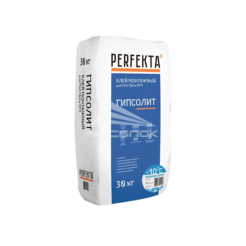 КЛЕЙ МОНТАЖНЫЙ Perfekta® "ГИПСОЛИТ" ЗИМНЯЯ СЕРИЯ предназначен для выполнения работ при отрицательных температурах по приклеиванию гипсокартонных и гипсоволокнистых листов (ГКЛ, ГВЛ), пазогребневых плит (ПГП), а также пенополистирольных и минераловатных плит на поверхности стен внутри помещений с нормальной влажностью.