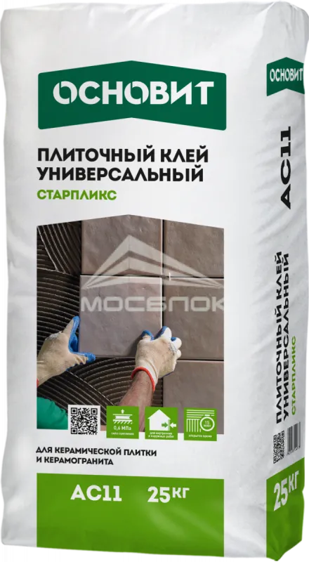 Клей для керамической плитки Старпликс AC11 универсальный, 25 кг Основит. Технические характеристики и преимущества: