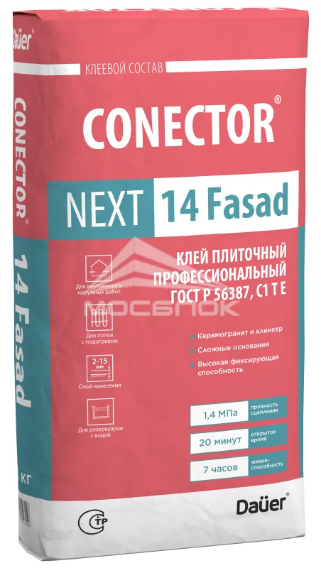Клей плиточный Dauer CONECTOR NEXT 14 Fasad профессиональный С1 TЕ 25 кг. Технические характеристики и преимущества: