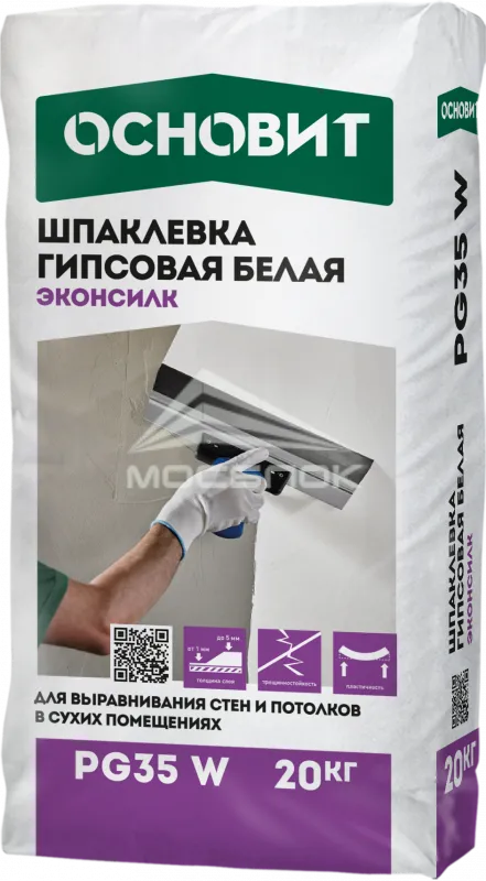 Шпаклевка гипсовая белая ЭКОНСИЛК PG35 W, 20 кг Основит в городе Москва — это надежное и универсальное решение для достижения идеально гладкой поверхности стен и потолков. Благодаря своим уникальным свойствам она становится незаменимым инструментом в арсенале как профессиональных строителей, так и домашних мастеров. Эта шпаклевка обеспечивает отличное сцепление с различными материалами, что подтверждается её высокой адгезией, позволяющей использовать ее на гипсокартоне, кирпичных и бетонных поверхностях. Например, при нанесении слоя толщиной всего в 1 мм она создает идеально ровную поверхность, что значительно облегчает последующую отделку — будь то покраска или оклейка обоями.
