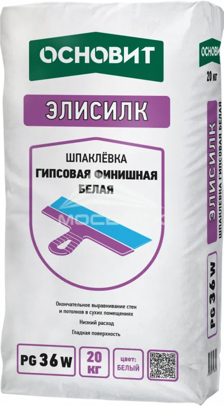 Шпаклевка гипсовая финишная белая ЭЛИСИЛК PG36 W, 20 кг Основит в городе Москва — это надежное и универсальное решение для достижения идеально гладкой поверхности стен и потолков. Благодаря своим уникальным свойствам она становится незаменимым инструментом в арсенале как профессиональных строителей, так и домашних мастеров. Эта шпаклевка обеспечивает отличное сцепление с различными материалами, что подтверждается её высокой адгезией, позволяющей использовать ее на гипсокартоне, кирпичных и бетонных поверхностях. Например, при нанесении слоя толщиной всего в 1 мм она создает идеально ровную поверхность, что значительно облегчает последующую отделку — будь то покраска или оклейка обоями.