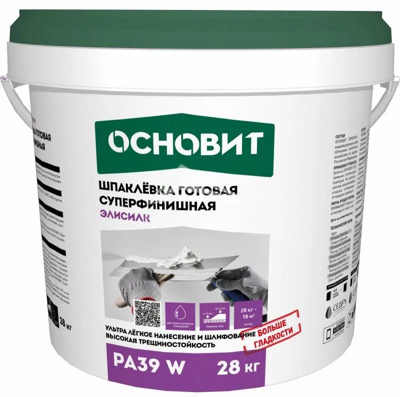 Шпаклевка готовая суперфинишная ЭЛИСИЛК PA39 W, 28 кг Основит в городе Москва — это надежное и универсальное решение для достижения идеально гладкой поверхности стен и потолков. Благодаря своим уникальным свойствам она становится незаменимым инструментом в арсенале как профессиональных строителей, так и домашних мастеров. Эта шпаклевка обеспечивает отличное сцепление с различными материалами, что подтверждается её высокой адгезией, позволяющей использовать ее на гипсокартоне, кирпичных и бетонных поверхностях. Например, при нанесении слоя толщиной всего в 1 мм она создает идеально ровную поверхность, что значительно облегчает последующую отделку — будь то покраска или оклейка обоями.