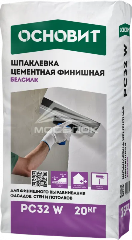 Шпаклевка цементная финишная белая БЕЛСИЛК PC32 W 20 кг Основит в городе Москва — это надежное и универсальное решение для достижения идеально гладкой поверхности стен и потолков. Благодаря своим уникальным свойствам она становится незаменимым инструментом в арсенале как профессиональных строителей, так и домашних мастеров. Эта шпаклевка обеспечивает отличное сцепление с различными материалами, что подтверждается её высокой адгезией, позволяющей использовать ее на гипсокартоне, кирпичных и бетонных поверхностях. Например, при нанесении слоя толщиной всего в 1 мм она создает идеально ровную поверхность, что значительно облегчает последующую отделку — будь то покраска или оклейка обоями.