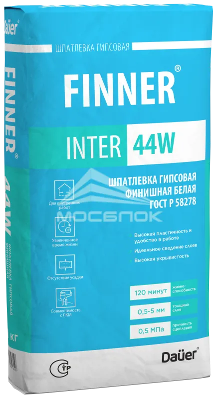 Шпатлевка гипсовая финишная Dauer FINNER INTER 44 W белая 120, 20 кг основные преимущества:
