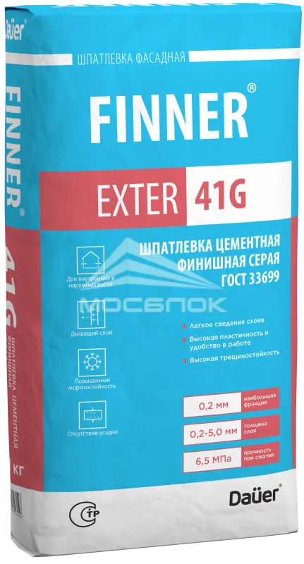 Шпатлевка цементная финишная Dauer FINNER EXTER 41G серая 180/6,5/F50, 20 кг в городе Москва отличается быстрым временем высыхания — обычно в пределах 2-3
