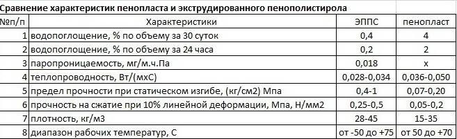 Таблица характеристик экструдированного пенополистирола.