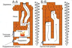 На 19 монтируют дверку для очистки, потом работа идет по схеме. В 24 делается сушилка, для этого кладется уголок, на него следующий слой, в нем монтируют дверцу для очистки. Выкладывают кирпич по конфигурации. На 30 ряду устанавливают 2 задвижки . Потом снова кладка по плану. После 38 сооружение выйдет на следующий этаж.