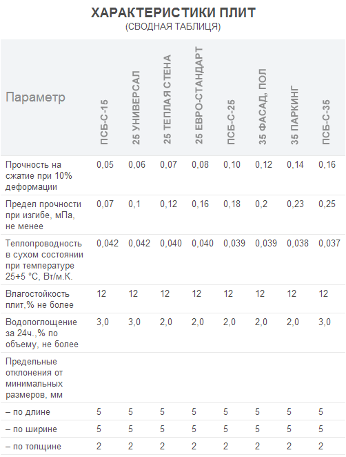 Плиты имеют прочность на сжатие в диапазоне 0,05-0,16 МПа. А вот на изгибе показатель равен 0,07-0,25 МПа. Коэффициент теплопроводности материала равняется пределу 0,033- 0,037 Вт/(м*К). Это гораздо меньше соответствующей характеристики, свойственной железобетону и кирпичу. Водопоглощение не превышает 1% в течение суток. Это исключает создание благоприятной среды для образования плесени и бактерий во внутреннем пространстве плит.