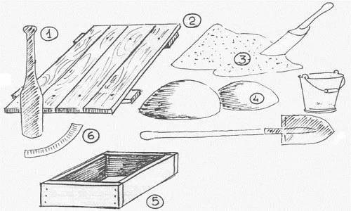 Материал и инструменты для изготовления кирпича: 1 пест (толкун), 2 настил, 3 песок с совком, 4 глина с лопатой, 5 творило, 6 скоба или скребок.